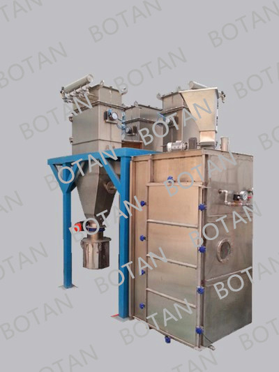 首先物料由噴嘴充分分散后攝入超細(xì)分級(jí)機(jī)中,在控制氣流的作用下,主氣流產(chǎn)生的附壁作用而向遠(yuǎn)離控制氣流的一方偏移,粗顆粒與較粗的顆粒會(huì)由于慣性流入不同的分級(jí)域,反復(fù)多次以后,粗、中、細(xì)各個(gè)流道的氣流有控制閥組調(diào)整保持各自的平衡,同時(shí)也避免粉末在超細(xì)分級(jí)機(jī)中二次抱團(tuán)。也有專門的回收裝置,避免污染環(huán)境。